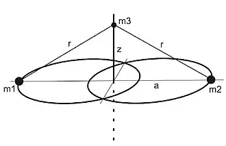 The system consists of two primary bodies with the same mass , which move in circular or elliptical Kepler orbits around their center of mass. The third body, which is substantially smaller than the primary bodies and whose mass can be set to zero , moves under the influence of the primary bodies in a plane that is perpendicular to the orbital plane of the primary bodies (see Figure 1). The origin of the system is at the focus of the primary bodies. A combined mass of the primary bodies , an orbital period of the bodies , and a radius of the orbit of the bodies are used for this system. In addition, the gravitational constant is 1. In such a system that the third body only moves in one dimension – it moves only along the z-axis.