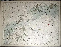 The Atlas Coeli was created in the period 1947-1948 at the Skalnaté Pleso Observatory in Slovakia (then Czechoslovakia) under the direction of Antonín Bečvář, based on an idea of Czechoslovakian amateur astronomer Josef Klepešta.[3] Much of the work was carried out by a volunteer group of students at the Observatory; the final plotting of the Atlas, which was entirely hand-drawn, was the work of Bečvář. Positional and magnitude data were taken from a number of existing catalogs, including the Henry Draper catalog, the Aitken New General Catalog of Double Stars, and the Boss General Catalog. About ten photographic atlases were used as well. To plot each of the objects, one of 20 stencil patterns was selected and positioned. It was also necessary to compute the shift in the apparent position of each of the objects to epoch 1950.0. About 3,000 man-hours of work were involved.[3]