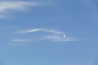 Along with pressure tendency, the condition of the sky is one of the more important parameters used to forecast weather in mountainous areas. Thickening of cloud cover or the invasion of a higher cloud deck is indicative of rain in the near future. At night, high thin cirrostratus clouds can lead to halos around the Moon, which indicate the approach of a warm front and its associated rain.[20] Morning fog portends fair conditions and can be associated with a marine layer, an indication of a stable atmosphere.[21] Rainy conditions are preceded by wind or clouds which prevent fog formation. The approach of a line of thunderstorms could indicate the approach of a cold front. Cloud-free skies are indicative of fair weather for the near future.[22] The use of sky cover in weather prediction has led to various weather lore over the centuries.[23]