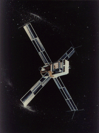 SAS 3 spacecraft as it might have appeared deployed on orbit. The nominal spin axis, or +z axis, points to the upper right, with the RMC and one-star tracker for attitude determination. The remaining instruments and a second star tracker point out of the image toward the viewer. The four solar panels charged batteries during orbit day.