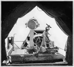 Hale's team set up their base on Mt. Wilson on February 29, 1904.[2] Helen Snow was initially opposed to moving the Snow Telescope to Mt. Wilson, so Hale instead brought a smaller solar telescope that had been used during the 1900 solar eclipse. Finally, in April 1904 Snow dropped her objections and allowed the relocation of the horizontal telescope to the Mt. Wilson station. The initial funding for this project came from a $10,000 grant by the Carnegie Institution,[1] plus personal funds provided by Hale.[6] The telescope was packed up for transport by mid-1904.[5] Regular funding for the observatory was obtained from the Carnegie Institute later that year.[6]