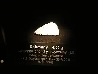 Sołtmany is an L6 ordinary chondrite[1] meteorite which fell on 30 April 2011 in Sołtmany village, Poland. The fall occurred at around 6:00 am.[1][2] A single meteorite penetrated the edge of a roof and shattered on concrete floor into several pieces. It was immediately found by the owners of the farm, alarmed by the loud noise.[1]
