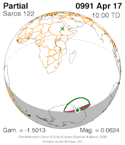 | 122 | 23 | December 11, 1387 | 9:58:30 | Annular | 52.4S 26.1E | -0.4843 | 0.9539 | 193 | 4m 16s | |