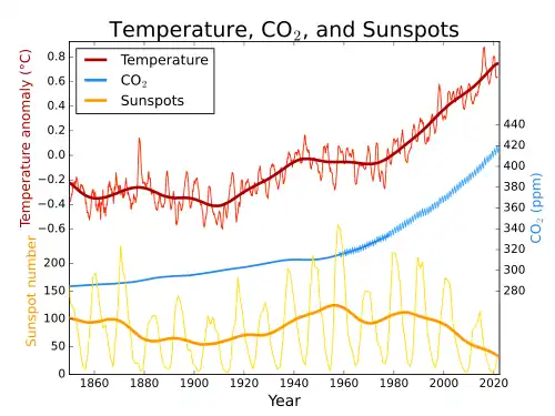 - 1 2 3 Lockwood, L.; Fröhlich, C. (October 2007). "Recent oppositely directed trends in solar climate forcings and the global mean surface air temperature". Proceedings of the Royal Society A. 463 (2086): 2447–2460. Bibcode:2007RSPSA.463.2447L. doi:10.1098/rspa.2007.1880. S2CID 14580351.