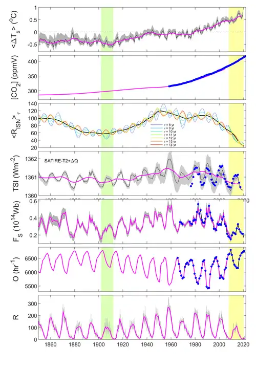 - ↑ Lockwood, Mike; Fröhlich, Claus (8 June 2008). "Recent oppositely directed trends in solar climate forcings and the global mean surface air temperature. II. Different reconstructions of the total solar irradiance variation and dependence on response time scale". Proceedings of the Royal Society A. 464 (2094): 1367–1385. Bibcode:2008RSPSA.464.1367L. doi:10.1098/rspa.2007.0347. S2CID 131159896.