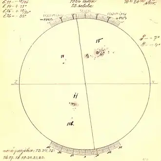 ![]() Sunspots recorded during solar cycle 15 (23 January 1923). | |