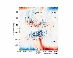 - ↑ Pevtsov, Alexei (13 March 2021). "Time vs. solar latitude diagram of the radial component of the solar magnetic field (supersynoptic map of "butterfly" diagram". Archived from the original on 17 February 2022. Retrieved 13 March 2021.