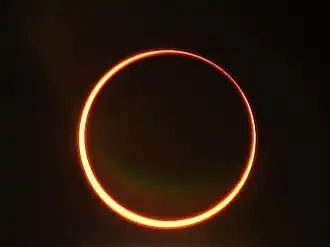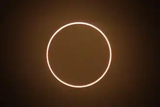 ![]() An annular solar eclipse occurs when the Moon is too far away to completely cover the Sun's disk (October 14, 2023). | |