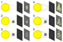 The safest way to view the Sun's disk is by indirect projection.[56] This can be done by projecting an image of the disk onto a white piece of paper or card using a pair of binoculars (with one of the lenses covered), a telescope, or another piece of cardboard with a small hole in it (about 1 mm diameter), often called a pinhole camera. The projected image of the Sun can then be safely viewed; this technique can be used to observe sunspots, as well as eclipses. Care must be taken, however, to ensure that no one looks through the projector (telescope, pinhole, etc.) directly.[57] A kitchen colander with small holes can also be used to project multiple images of the partially eclipsed Sun onto the ground or a viewing screen. Viewing the Sun's disk on a video display screen (provided by a video camera or digital camera) is safe, although the camera itself may be damaged by direct exposure to the Sun. The optical viewfinders provided with some video and digital cameras are not safe. Securely mounting #14 welder's glass in front of the lens and viewfinder protects the equipment and makes viewing possible.[55] Professional workmanship is essential because of the dire consequences any gaps or detaching mountings will have. In the partial eclipse path, one will not be able to see the corona or nearly complete darkening of the sky. However, depending on how much of the Sun's disk is obscured, some darkening may be noticeable. If three-quarters or more of the Sun is obscured, then an effect can be observed by which the daylight appears to be dim, as if the sky were overcast, yet objects still cast sharp shadows.[58]