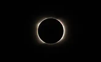 ![]() A total solar eclipse occurs when the Moon completely covers the Sun's disk. Solar prominences can be seen along the limb (in red) as well as extensively the coronal and partly the radiating coronal streamers. (August 11, 1999) | |