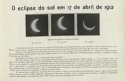 ![]() The 1 May 1912 edition of the luso-Brazilian Brasil-Portugal magazine publishes photographs of the eclipse, as it was seen in Lisbon. An editorial says: "One can tell, on that moment, the mathematical regularity that presides over everything that goes on above and the considerable achievements that the oldest of sciences — Astronomy — has been meeting. While some, strong spirits, point out the fact and point out how precise are scientific calculi, the others, believers, consider that what we can grasp is still too little and, not being able to conceive a Creation without a Creator, pay homage to science but continue to kneel before God. The reader can judge the interest that the phenomenon sparked among us by himself though the photographs that follow, where one can see it all; the wise and the godless, the noble and the commoners, women and men, everyone paid no attention to earthly matters and, for a moment, observed with better or worse instruments what was going on up above. It was even a momentaneous rest for politics." |