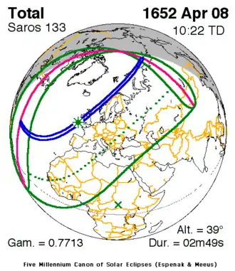 A total solar eclipse occurred on April 8 New Style (NS), 1652, a Monday. In contemporary British sources, the date is alternately listed as March 29, 1652 following the Old Style (OS) as Great Britain had not yet adopted of the Gregorian Calendar by that time.[1][2] 19th century authors further adjusted the date to March 25 NS, 1652.[3] A solar eclipse occurs when the Moon passes between Earth and the Sun, thereby totally or partly obscuring the image of the Sun for a viewer on Earth. A total solar eclipse occurs when the Moon's apparent diameter is larger than the Sun's, blocking all direct sunlight, turning day into darkness. Totality occurs in a narrow path across Earth's surface, with the partial solar eclipse visible over a surrounding region thousands of kilometres wide. The path of totality intersected the British Isles, as well as passing just off the west coast of Norway.