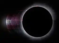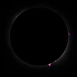 The eclipse occurred around the solar maximum, a period of greatest solar activity in the Sun's 11-year solar cycle, and it was anticipated that solar prominences would be visible during totality.[50] Many observers reported seeing solar prominences during the event.[51][52][53] Most plainly visible to the naked eye was a very bright red point of light near the lowest portion of the Sun's disk, which on telescopic views and photographs showed as a tent-shaped angular structure. The red and pink hues were the result of hydrogen and helium plasma being thrown up in broad arcs but never leaving the sun's atmosphere.[54][55] Telescopic photographs revealed the western limb having several smaller, irregular shapes, of which one large, ragged shape appeared disconnected from the Sun's surface on one side. Several smaller prominences were also visible on the eastern limb, though because of the eclipse's relatively high magnitude, prominences on both limbs could not be viewed at the same time. These shapes correlate in detail with the NASA Solar Dynamics Observatory solar telescope images taken in space at the same as the earthbound eclipse, and with images from the ground-based National Solar Observatory GONG telescope in Cerro Tololo, Chile.