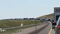 Highways in the area of totality saw significant increases in traffic, with departing tourists caught in traffic jams lasting up to eight hours.[69] Many of those trying to drive down Interstate 93 in New Hampshire, for example, found themselves in jams lasting until at least 2 a.m. the following morning, resulting in numerous cars breaking down.[70] Drivers and passengers spent four to six hours to pass through Franconia Notch where Interstate 93 is reduced to a single lane in each direction. Major highways in the state remained crowded through rush hour the following morning and into the afternoon.[71] A similar effect was seen during the following morning's rush hour in northbound Interstate 65 in Indianapolis.[72] In Vermont there were an estimated 60,000 additional cars and 248 inbound aircraft over the span of the eclipse weekend, with about 160,000 visitors coming into the state per Secretary of Transportation Joe Flynn.[73] Drivers in southern Illinois leaving the region of totality to the north toward St. Louis, Missouri faced more than 80 miles of stop-and-go heavy congestion.[74] Unlike other regions, traffic was lighter in Texas than the state's Department of Transportation had anticipated.[68]