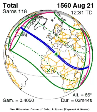 A total solar eclipse occurred on August 21, 1560. A solar eclipse occurs when the Moon passes between Earth and the Sun, thereby totally or partly obscuring the image of the Sun for a viewer on Earth. It's an astronomical phenomenon where, during the moon's orbit around Earth, it passes in from the Sun and causes a solar eclipse. People can't view it with the naked eye, with consequences are horrible as losing your eyesight. Most of the first stages of a solar eclipse can be visible with the naked eye.[1] A total solar eclipse occurs when the Moon's apparent diameter is larger than the Sun's, blocking all direct sunlight, turning day into darkness. Totality occurs in a narrow path across Earth's surface, with the partial solar eclipse visible over a surrounding region thousands of kilometers wide. This eclipse is part of solar Saros 118.