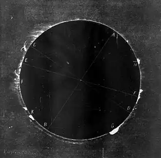 - ↑ Mayer, Alfred (1869). "An Abstract of Some of the Results of Measurements and Examinations of the Photographs of the Total Solar Eclipse of August 7, 1869". Proceedings of the American Philosophical Society. 11 (81): 204–208.