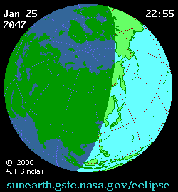 A partial solar eclipse will occur at the Moon's ascending node of orbit between Friday, January 25 and Saturday, January 26, 2047,[1] with a magnitude of 0.8907. A solar eclipse occurs when the Moon passes between Earth and the Sun, thereby totally or partly obscuring the image of the Sun for a viewer on Earth. A partial solar eclipse occurs in the polar regions of the Earth when the center of the Moon's shadow misses the Earth.