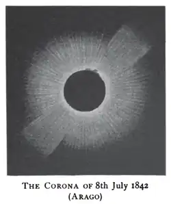 A total solar eclipse occurred at the Moon's descending node of orbit on Friday, July 8, 1842, with a magnitude of 1.0543. A solar eclipse occurs when the Moon passes between Earth and the Sun, thereby totally or partly obscuring the image of the Sun for a viewer on Earth. A total solar eclipse occurs when the Moon's apparent diameter is larger than the Sun's, blocking all direct sunlight, turning day into darkness. Totality occurs in a narrow path across Earth's surface, with the partial solar eclipse visible over a surrounding region thousands of kilometres wide. Occurring about 2 days before perigee (on July 10, 1842, at 7:50 UTC), the Moon's apparent diameter was larger.[1]