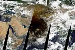 The path of this annular eclipse passed through parts of the Democratic Republic of the Congo, South Sudan, Ethiopia, and Eritrea in Africa; the southern Arabian Peninsula, including Yemen, Oman, and southern Saudi Arabia; parts of South Asia and the Himalayas, including southern Pakistan and northern India; and parts of East Asia, including South China and Taiwan.[9] A partial eclipse was visible throughout much of the rest of Africa, Southeast Europe, most of Asia, and in New Guinea and northern Australia just before sunset. In Europe, the partial eclipse was visible to places southeast of the line passing through parts of Italy, Hungary, Ukraine, and southwestern Russia.[9]