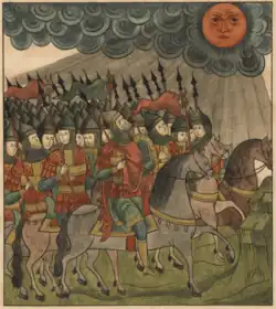 The eclipse was mentioned in the Kievan Rus' epic poem Lay of the Host of Igor.[11] It was seen by Prince Igor Svyatoslavich and his army whilst on their campaign against the Polovtsians,[12] and was interpreted as a message from God prophesying trouble,[13] frightening Igor's men who thought it a bad omen.[14][15] According to the Lay, after the eclipse Igor gave a long speech to his retinue to allay their fears before proceeding on his campaign.[16]