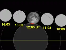 Shown below are two tables displaying details about this particular solar eclipse. The first table outlines times at which the moon's penumbra or umbra attains the specific parameter, and the second table describes various other parameters pertaining to this eclipse.[9]
