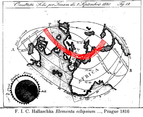 This map was drawn in the book Elementa eclipsium, published in Prague in 1816, by Franz Ignaz Cassian Hallaschka (František Ignác Kassián Halaška) (1780-1847), contained maps of the paths of solar eclipses from 1816 and 1860. The geometric constructions used by Hallaschka anticipated the standard theory of eclipses later developed by Friedrich Wilhelm Bessel.[2]