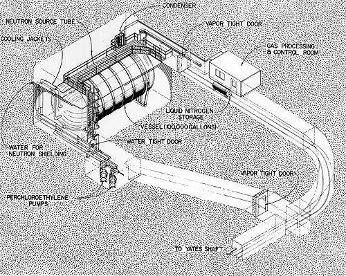 Once the theoretical value was determined, the astrophysicists began pursuing experimental confirmation. Davis developed the idea of taking hundreds of thousands of liters of perchloroethylene, a chemical compound made up of carbon and chlorine, and searching for neutrinos using a chlorine-argon detector.[1] The process was conducted very far underground, hence the decision to conduct the experiment in Homestake as the town was home to the Homestake Gold Mine.[1] By conducting the experiment deep underground, Bahcall and Davis were able to avoid cosmic ray interactions which could affect the process and results.[2] The entire experiment lasted several years as it was able to detect only a few chlorine to argon conversions each day, and the first results were not yielded by the team until 1968.[2] To their surprise, the experimental value of the solar neutrinos present was less than 20% of the theoretical value Bahcall calculated.[2] At the time, it was unknown if there was an error with the experiment or with the calculations, or if Bahcall and Davis did not account for all variables, but this discrepancy gave birth to what became known as the solar neutrino problem.