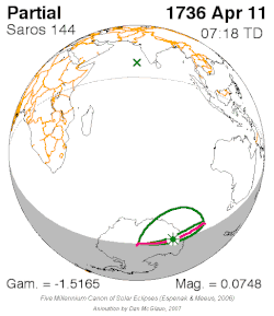| 144 | 1 | April 11, 1736 | 7:18:07 | Partial | 71.5S 134.3E | -1.5166 | 0.0748 | |||