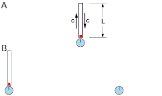 Two observers in relative motion receive information about two events via light signals traveling at constant speed, independent of either observer's speed. Their motion during the transit time causes them to get the information at different times on their local clock.