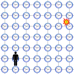 Combined with other laws of physics, the two postulates of special relativity predict the equivalence of mass and energy, as expressed in the mass–energy equivalence formula , where is the speed of light in vacuum.[7][8] Special relativity replaced the conventional notion of an absolute, universal time with the notion of a time that is local to each observer.[9]:33 Information about distant objects can arrive no faster than the speed of light so visual observations always report events that have happened in the past. This effect makes visual descriptions of the effects of special relativity especially prone to mistakes.[10]