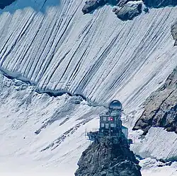 The Sphinx Observatory is an astronomical observatory located above the Jungfraujoch in Switzerland. It is named after the Sphinx, a rocky summit on which it is located. At 3,571 m (11,716 ft) above mean sea level, it is one of the highest observatories in the world. Accessible to the public, it is also the second highest observation deck in Switzerland. The mountain top has been tunneled to fit an elevator which ascends to the observatory from the Jungfraujoch railway station, the highest such train station in Europe. The building is located on the Valais side of the border, only a few metres from the canton of Bern, although it is accessed via the Jungfrau Railway from the Bernese Oberland.