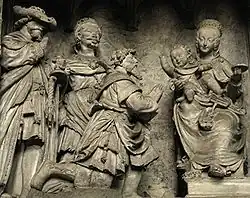 The Magi are sometimes called "kings" because of the belief that they fulfill prophecies in Isaiah and Psalms concerning a journey to Jerusalem by gentile kings.[38] Isaiah mentions gifts of gold and incense.[39] In the Septuagint, the Greek translation of the Old Testament probably used by Matthew, these gifts are given as gold and frankincense,[40] similar to Matthew's "gold, frankincense, and myrrh."[41] The gift of myrrh symbolizes mortality, according to Origen.[37]
