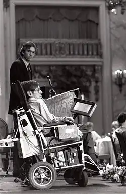 Hawking rarely discussed his illness and physical challenges—even, in a precedent set during their courtship, with Jane.[223] His disabilities meant that the responsibilities of home and family rested firmly on his wife's shoulders, leaving him more time to think about physics.[224] Upon his appointment in 1974 to a year-long position at the California Institute of Technology in Pasadena, California, Jane proposed that a graduate or post-doctoral student live with them and help with his care. Hawking accepted, and Bernard Carr travelled with them as the first of many students who fulfilled this role.[225][226] The family spent a generally happy and stimulating year in Pasadena.[227]