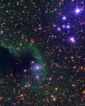 ![]() ESO VST image of the most massive stars in Stock 16 in the upper right and some nebulosity of RCW 75 on the lower left | |