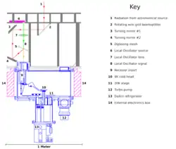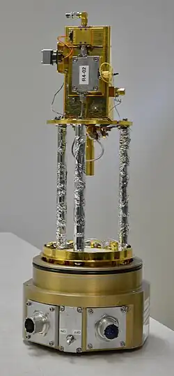 The SMA uses cryogenic SIS heterodyne receivers, at a bent Nasmyth focus.[5] All receivers are mounted in a single large cryostat within the antenna cabin. The cryostat can accommodate up to eight receiver inserts, each of which holds a single receiver. A rotating wire grid beam splitter followed by a rotating mirror directs the two linear polarizations of the incoming radiation to two of the receiver inserts. This allows the array to observe either a single polarization of two different frequency bands simultaneously, or both polarizations of a single band simultaneously to improve sensitivity and measure Stokes parameters.