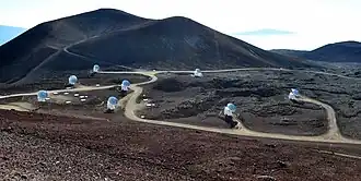The SMA was built just northwest of the saddle between the cinder cones Pu'u Poli'ahu and Pu'u Hauoki, about 140 meters below the summit of Mauna Kea.