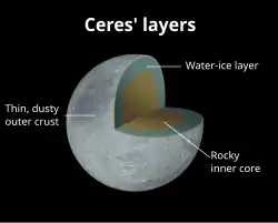Ceres appears to be differentiated into a rocky core and icy mantle and may harbour a liquid-water ocean under its surface.[30][31]