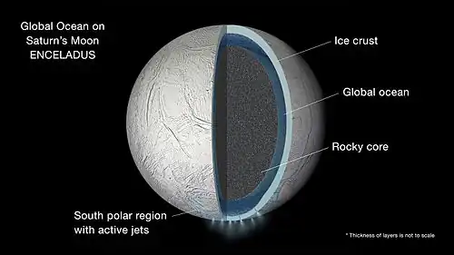 - 1 2 Platt, Jane; Bell, Brian (2014-04-03). "NASA Space Assets Detect Ocean inside Saturn Moon". NASA. Retrieved 2014-04-03.
