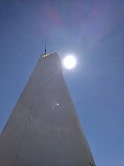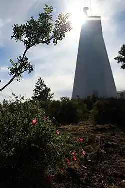 On the western side of the Sacramento peak,[5] there are wide open views of Apache Point Observatory and Sloan Digital Sky Survey telescopes. From the overlook beside the telescope, White Sands National Park stands out as gypsum white[6] against the sandy background of the desert. On a clear day it is possible to see all the way south to the cities of El Paso, Texas, and Ciudad Juárez, Mexico, and all the way north to the Trinity test site. The overlook can also be used for viewing rocket launches from White Sands Missile Range.