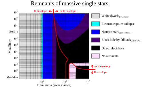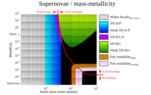 The table below lists the known reasons for core collapse in massive stars, the types of stars in which they occur, their associated supernova type, and the remnant produced. The metallicity is the proportion of elements other than hydrogen or helium, as compared to the Sun. The initial mass is the mass of the star prior to the supernova event, given in multiples of the Sun's mass, although the mass at the time of the supernova may be much lower.[102]
