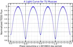 TU Muscae, also known as HD100213, is an eclipsing binary star in the constellation Musca. Its apparent magnitude ranges from 8.17 to 8.75 over around 1.4 days.[4]