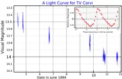 The system consists of a white dwarf and a donor companion which orbit around a common centre of gravity every 1.5096 hours (90.54 minutes).[7] The white dwarf sucks matter from the other star via its Roche lobe onto an accretion disc which is heated and changes viscosity before collapsing, typically reaching magnitude 13 in these outbursts and remaining near magnitude 19 when quiet.[3] In TV Corvi, these outbursts can be split into frequent eruptions and two types of less frequent supereruptions, behaviour found in a group of dwarf novae known as SU Ursae Majoris stars.[6] The AAVSO has recorded maxima as bright as visual magnitude 12.2.[8]