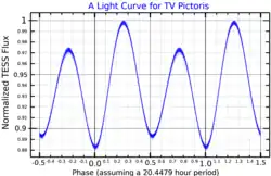TV Pictoris is a rotating ellipsoidal variable star in the constellation Pictor. It ranges between apparent magnitude 7.37 - 7.53 over a period of 0.85 days.[3] It was first discovered to be variable in 1987.[5] The system is inclined at an angle of 54 degrees to observers on Earth. It is composed of a primary star that has a radius 4.3 times that of the sun and 1.2 times its mass, and an effective (surface) temperature of 8300 K, and a secondary star with a radius 2.1 times that of the sun and 40% of its mass, and an effective temperature of 7000 K. Both stars are less massive than expected for a main sequence star of their temperatures. The secondary rotates much faster than the primary.[6]