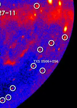 A search of this region in the sky, 1.33 degrees across, yielded only one likely source: TXS 0506+056, a previously-known blazar, which was found to be in a flaring state of high gamma ray emission.[7][6] It was subsequently observed at other wavelengths of light across the electromagnetic spectrum, including radio, infrared, optical, X-rays and gamma-rays.[7][24] The detection of both neutrinos and light from the same object was an early example of multi-messenger astronomy.[11]