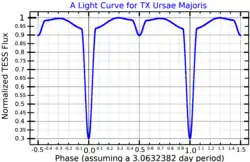 TX Ursae Majoris is an eclipsing binary star system in the northern circumpolar constellation of Ursa Major. With a combined apparent visual magnitude of 6.97,[3] the system is too faint to be readily viewed with the naked eye. The pair orbit each other with a period of 3.063 days in a circular orbit,[7] with their orbital plane aligned close to the line of sight from the Earth. During the primary eclipse, the net brightness decreases by 1.74 magnitudes, while the secondary eclipse results in a drop of just 0.07 magnitude.[5] TX UMa is located at a distance of approximately 780 light years from the Sun based on parallax measurements,[2] but is drifting closer with a mean radial velocity of −13 km/s.[6]