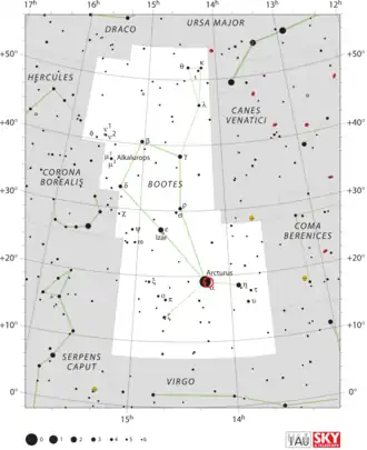 T Boötis is believed to have been a nova. It was observed by only one person, Joseph Baxendell, on 9, 11 and 22 April 1860, but has not been seen since.[2] It is located less than half a degree from Arcturus in the constellation Boötes and was at magnitude 9.75 when first seen, and magnitude 12.8 when last seen.[2] Other astronomers, including Friedrich Winnecke, Edward Charles Pickering, Ernst Hartwig and Ernst Zinner looked for a star in this location without success.[3]