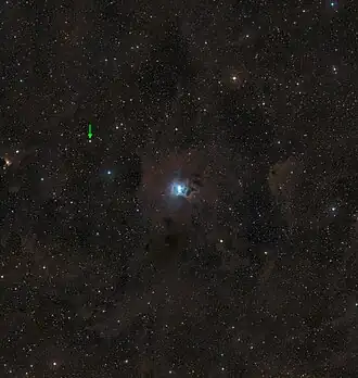 ![]() Region of NGC 7023, T Cephei is marked with a green arrow Credit: NASA, ESA and Digitized Sky Survey 2 | |
