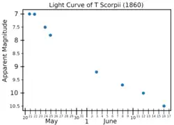 T Scorpii, or Nova Scorpii 1860, was a nova in the globular cluster Messier 80 (M80). It was discovered on 21 May 1860 by Arthur von Auwers at Koenigsberg Observatory and was independently discovered by Norman Pogson on May 28 at Hartwell observatory.[4][5] It was at magnitude 7.5 at discovery, reaching a maximum of magnitude 6.8, outshining the whole cluster.[6]