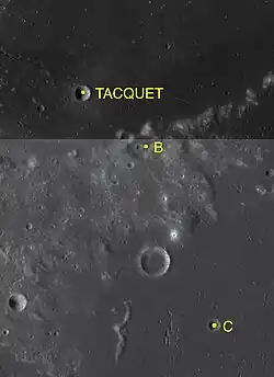 By convention these features are identified on lunar maps by placing the letter on the side of the crater midpoint that is closest to Tacquet.
