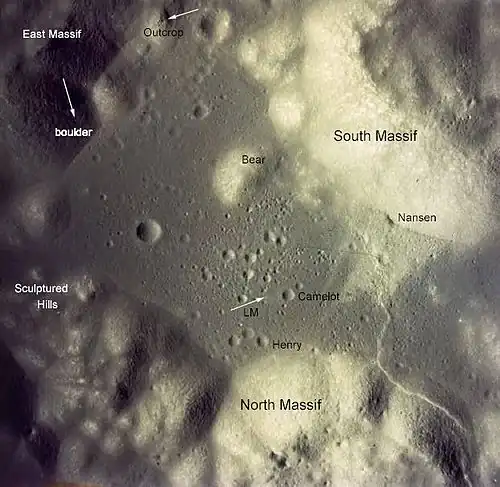 - ↑ "Landing at Taurus-Littrow". Apollo 17 Lunar Surface Journal. National Aeronautics and Space Administration. Retrieved 7 September 2010.
